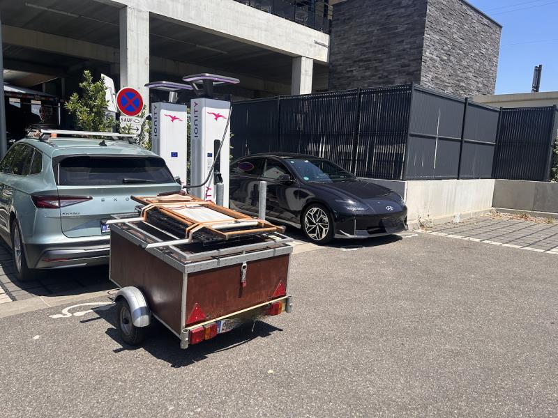 Matkamme kolmas päivä käynnistyi ilmastoidussa hotellihuoneessa hyvin nukutun yön jälkeen kohti Strasbourgia. Ajatuksenani oli ajaa Frankfurtin ohi moottoriteitä ja lähenpänä Ranskan rajaa siirtyä ajelemaan hetkeksi Saksan maaseututeitä. Lähtö hotellilta tapahtui 100 % tasolle hotellin parkissa melko arvokkaaseen 59 snt/kWh hintaan ladatulla akulla.
