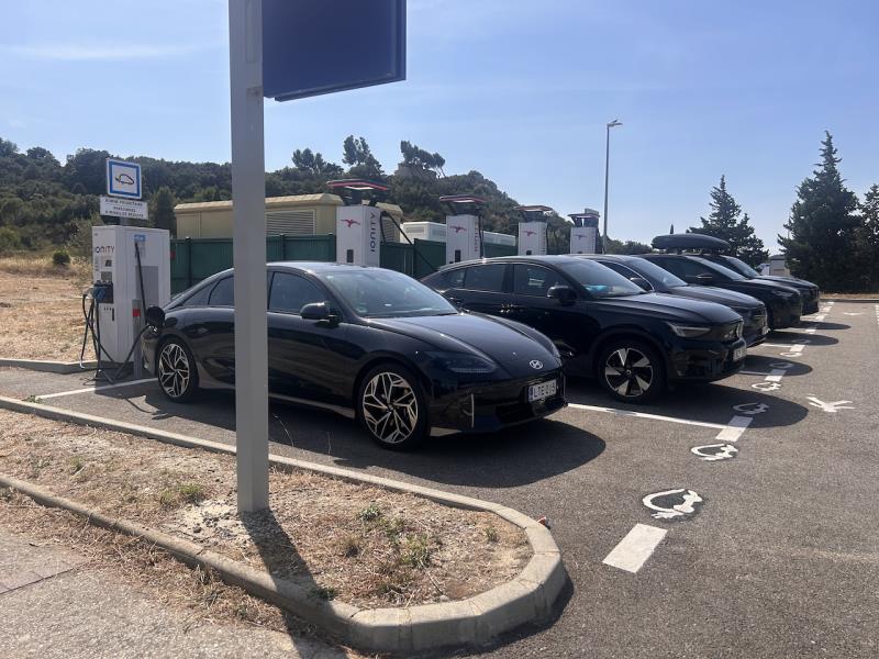Seuraava päivän siirtymä oli parin sadan kilometrin luokkaa ja otimme sähköä vielä Tavel Nord -laturilta. Nyt melkein kohtasimme tähän mennessä noin 2800 kilometrin matkalla ensimmäisen jonotustarpeen, kun asemalla olivat kaikki tehokkaat laturit varattuina. onneksi vapaana oli kuitenkin 50 kW:n laturi, mihin kytkin auton latautumaan. Meille riitti hyvin vähäinen lataus, koska koko tämän päivän 437,7 km siirtymään Alppien juurella olevasta La Clusazista Välimeren rantaan laskiessa olisimme selvinneetä todennäköisesti jopa ilman yhtään välilatausta.