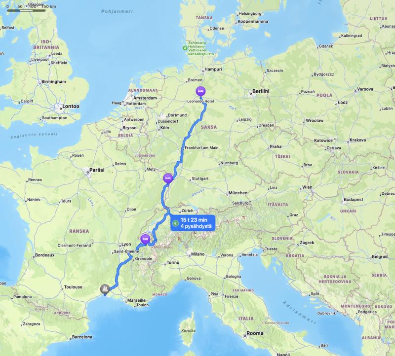 2.7.2025 Hannoverista Strasbourgiin 601 kilometriä siirtymä yhteensä