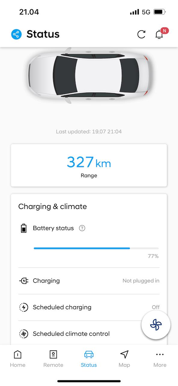 Perillä hotellin parkissa autossa oli jäljellä 77 % varaustaso. Tästä pääsen myöhemmin viimeisessä blogikirjoitusten sarjan osassa, eli yhteenvedossa, laskemaan koko matkan Tukholmasta takaisin Tukholmaan sähkön kulutuksen ladatusta energiasta, koska lähtiessä autossa oli noin 90 % varaustaso ja minulla on kirjaus kaikista tapahtuneista latauksista.