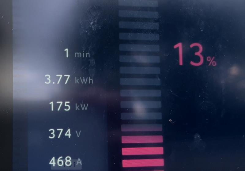 Autoon oli asennettu 3.2 softa juuri ennen matkaan lähtöä. Sen etu tuli kyllä ilmi pian matkan aikana suurteholatauksessa. Nimittäin noin 10 % tasolta aloitettu suurteholataus nosti lataustehon hetkeksi parhaimillaan peräti 175 kW:n tasolle. Silloin oli käytössä 374V-latausjännite ja 468A-latausvirta, eli 374 x 468 = 175 kW. Aiemmin ennen päivitystä korkein latausteho oli noin 135 kW:n tasolla. Samalla havaitsin, että MEB-autot, tai ainakin omani kykenee yli 150 kW:n lataustehoon ainoastaan 500A:n latauskaapelilla varustetuissa suurteholatauspisteissä. Suurin latausteho säilyi kuitenkin vain hetken noin 11 - 14 % välin ja sen jälkeen latausteho lähti aika nopeaan laskuun.