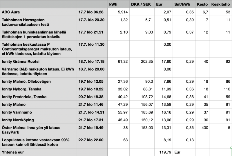Tarkkaa ladatun sähkön määrää en saanut tällä kertaa selville, koska matkan aikana tein kaksi maksutonta latausta enkä tullut kirjanneeksi ylös alku- ja loppuvaraustasoja akusta. Sen sijaan ladatun sähkön hinnan sain laskettua tarkkaan. Käytin latauksiin yhteensä 119,79 euroa rahaa, sisältäen kotona tapahtuneen loppulatauksen vastaavaan tasoon, millä liikkeelle lähtö tapahtui. Tämän lomamatkan liikenne-energian hinnaksi kertyi 5,22 euroa / 100 km.