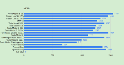 Ylläpidän blogissani myös taulukkoa myynnissä olevien ja tulossa olevien sähköautojen perustiedoista. Lasken tähän taulukkoon myös hinnan e/kWh.