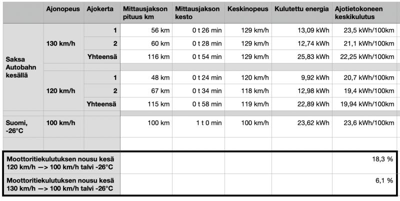 Yllätyin siitä, miten pieni ero talven -26°C kelissä ajettun ajon kulutuksella oli kesäkeliin. Nyt talven -26°C kelissä ajettuna keskikulutus toteutui 23,6 kWh / 100 km, kun kesäkelissä se toteutui 120 km/h nopeudessa 19,94 kWh/100 km ja 130 km/h nopeudessa 22,25 kWh/100 km. Suhteellinen talven kulutuksen nousu oli vain 6,1 % verrattuna kesän 130 km/h nopeuteen ja 18,3 % verrattuna kesän 120 km/h nopeuteen.