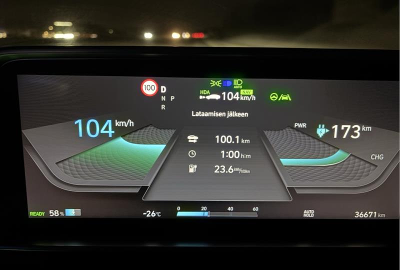 Toisaalta -26°C kelissä Hyundainkin kulutusta jo nostaa se, että energiatehokkaasti lämpöä tuottavasta lämpöpumpusta ei enää ole apua, vaan kaikki lämpö tuotetaan vastuksilla. Tämä näkyy siinä, että hieman maltillisemmalla pakkasella auton lämmityslaite on haukannut alkuun noin 4,5 kW:n tehoja ja pian se on pudonnut alle 3 kW:n tehoihin. Nyt tuossa -26°C kelissä lämmitin toimi liikkeelle lähdössä jopa 7,46 kW:n teholla ja tasoittui siitä sitten ajon ja mittausjakson ajaksi noin 4,3 kW:n tasoon.