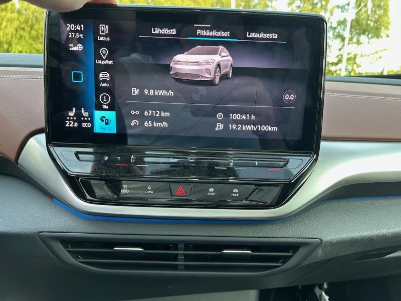 Kuva alla: Edellisen kuvan yhteydessä mainitsemallani kesän 2023 Euroopan ajolla toteutui auton ajotietokoneen mukaan 19,2 kWh/100 km keskikulutus. Kirjaamistani kaikista koko matkan latauksista laskien, auton keskikulutus toteutui 21,15 kWh/100 km. Kuvassa näkyy myös Volkswagenin tapa ilmoitaa hetkellinen kulutus yksiköllä kWh/h.
