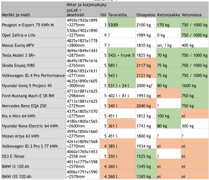 Kuljetuskapasiteetiltaan arvatenkin Stellantiksen pakettiautoon pohjautuva kaksikko on keulilla. Henkilöautoista Teslan Model3 ja VW:n ID.4 ovat hyviä autoja myös tilan suhteen. Bemarikaksikko jää pienimpänä autona hännille.