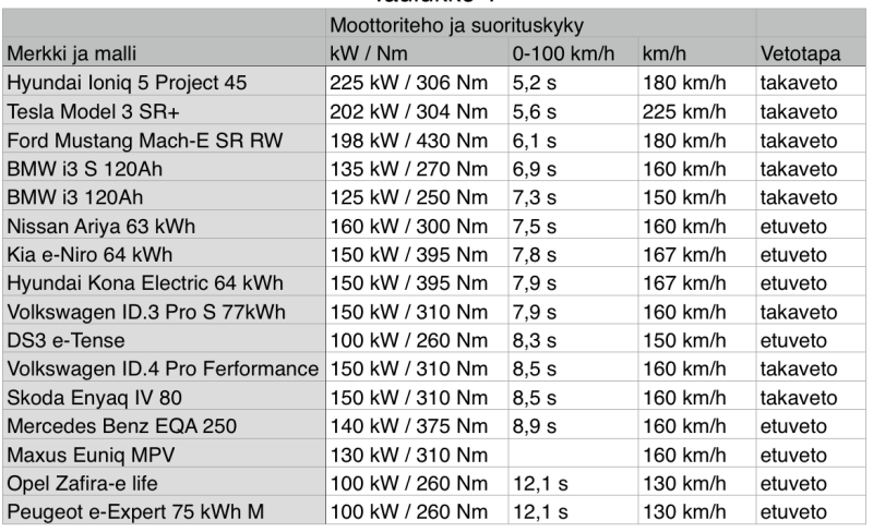 Kiihtyvyydessä pisimmän korren näyttäisi vetävän Ioniq5 ja Teslan Model3 seuraa heti perässä. Fordin Mustang Mach-e ja BMW i3S myös pääsevät mielestäni erinomaiseen seiskan alittavaan lukuun 0-100 km/h kiihtyvyydessä.