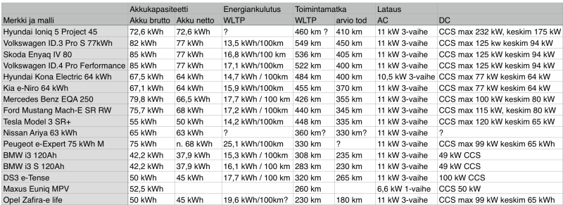 Toimintamatka, arvio tod. on otettu ev-database -sivustolta kohdasta EVDB real range. Siihen voisi ottaa myös minkä tahansa muun realistisemman arvion ko sivustolta, mutta nyt tässä vaiheessa päädyin käyttämään tätä mittaria.