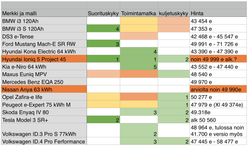 Mitä sähköautoja saa keväällä 2021 hintaluokassa 40.000 - 50.000 euroa? Seuraan aktiivisesti uutisointia uusista sähköautoista ja niistä on syntynyt mielikuva, että tässä hintaluokassa alkaa olla jo laajasti tarjontaa Suomessa tulevana keväänä ja kesänä. Kun keräsin tarjoomaa yhteen taulukkoon maahantuojien sivustoilta ja muutamasta muusta lähteestä, totesin, että ei niitä nyt sitten kuitenkaan vallattoman paljoa ollut ja osa näistäkin on vasta tulossa ja esimerkiksi Ariyan toimituksista en osaa sanoa ovatko menossa ensi vuoden puolelle.