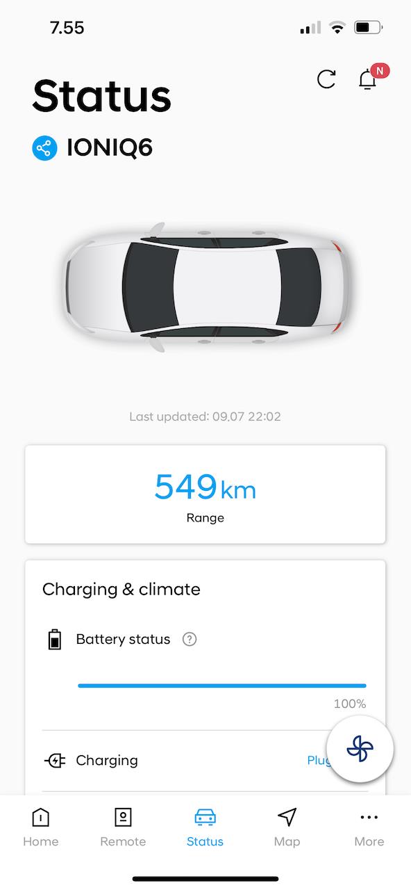 Auton GOM antoi etelä-Ranskassa pyörimiemme ajojen jälkeen 100 % varautasolla 549 km toimintamatka-arvion. Harvoin noin suurta pääsee näkemään Ioniq 6 autossa. GOM perustuu edellisten ajojen kulutukseen, eikä se esimerkiksi kerro mitään sähköauton akuston kuntoisuudesta. Eikä se myöskään pysty olemaan tarkka ennuste, kuinka pitkälle autolla pääsee tästä eteenpäin, jos keli tai ajonoopeus poikkeaa aiemmista ajoista. Sen sijaan Auton navigaattorin ennuste kohteessa olevaksi akuston varaustasoksi on myös Ioniq 6:ssa yllättävän tarkka.