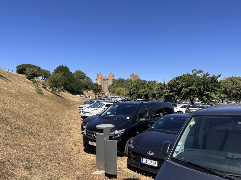 Carcassonnen linnoituskaupunki on keskiajalta ja sen löytää tarkemmin käyttämällä La Cíte-hakua navigaattorissa. Meille kertyi matkaa Carcassonneen vain noin 170 kilometriä, joten emme tarvinneet välipysähdyksiä itsellemme, emmekä ladataksemme autoa ja olimme perillä kohteessa hyvissä ajoin ennen puolta päivää.