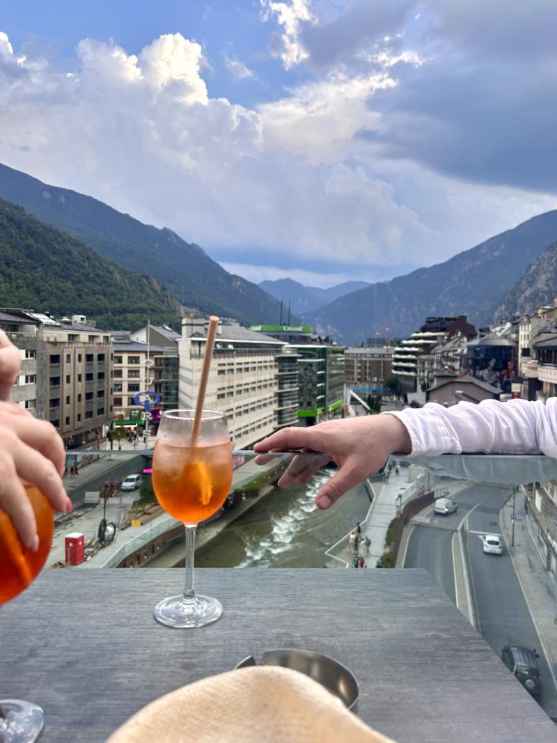 Andorra La Vellaa halkoo Riu Valira d'Orient -joki ja kaupungissa on kaksi pääostoskatua: Avenua Meritxell ja Avenue Carlemany. Kävimme mekin siellä ostoksia suunnittelemassa sekä tietenkin ruokailemassa. Samalla meille konkretisoitui, että Adorra näyttää olevan Ranskalaisille edullisen mm kosmetiikan, elektroniikan sekä tupakkatuotteiden ostostpaikka etenkin viikonloppuisin. Näitä liikkeitä pääostoskatu oli vierivieressä. Etsin googlesta parhaan näköalan terassia La Vellasta ja päädyhimme nauttimaan Aperollit Plan B -nimiselle terasille, mikä olikin aika korkean rakennuksen kattotasolla. Sijoituimme terassin teräväksi muotoiltuun kärkeen, mihin mahtuu juuri ja juuri kaksi ihmistä istumaan lasikaiteiden väliin ja pudotusta oli niin paljon, että kuvan ottamisesta ei meinannut huimaamiselta tulla yhtään mitään.