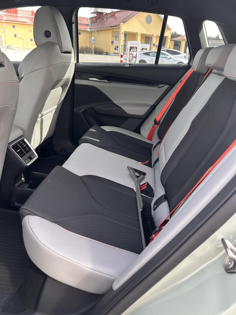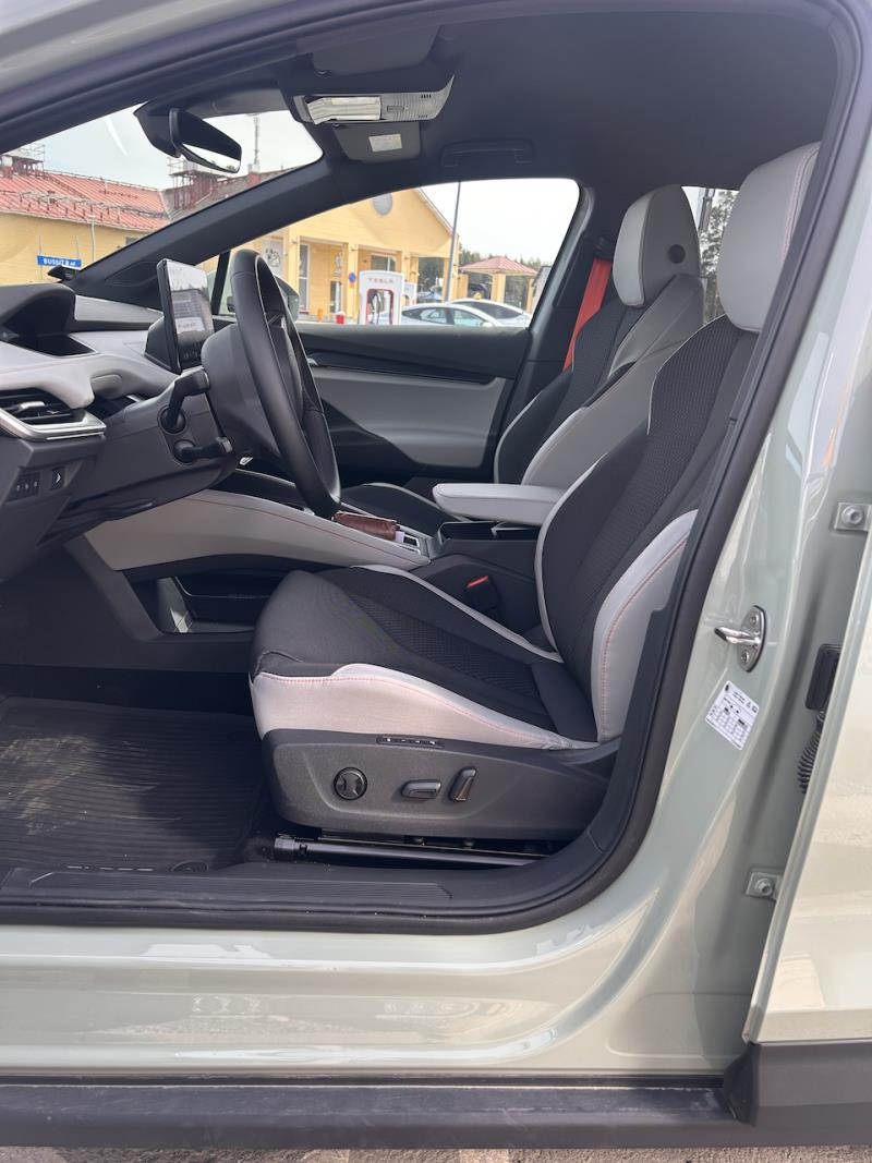 Etuistuimen lisävarusteisilla sähkösäädöillä ja ratin manuaalisella säädöllä sain tutun tuntuisen ja hyvän ajoasennon. Istuinverhoilu on varmastikin ihan perushyvä, mutta itse totesin haluavani Suite-varustelun nahkaiset istuimet sekä kojelaudan mielekkäämmät materiaalit. Takaistuimella on aivan vastaavat tilat, mitä Enyaqissa, eli hyvin sopii istumaan.