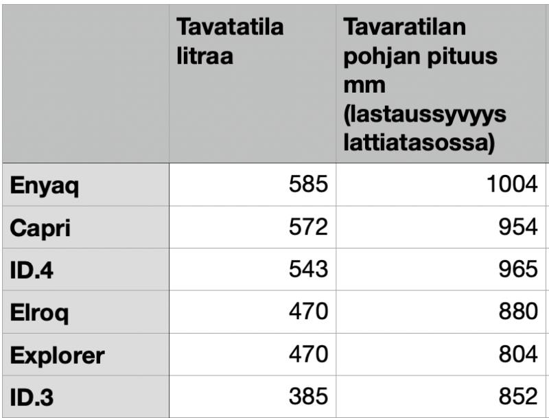 Jo silmämääröisesti Elroq ja Enyaq ovat toisaan vastaavat autot keulasta taka-akseliin asti. Ero näyttää olevan takaylityksessä ja sitä myöten peräkontissa. Skodan sivustolta tallentamani kuvapari vahvistaa tuon tunteen. Ainoa merkittävä ero mitoissa on peräkontin lattian pituudessa. Enyaqin tavaratilan lattian pituus on 1004 mm, kun Elroqissa se on 12,4 cm lyhyempi, eli 880 mm. Tämän myötä Elrogin 470 litran tavaratila on 115 litraa pienempi, kuin Enyaqin 585 litran takakontti. Miten tuo Elroqin tavaratila sitten suhtautuu muihin MEB-autoihin? Laitoin muutamia MEB-autoja tavaratilan litrojen mukaan järjestykseen ja laitoin tavaratilan lattian pituuden, eli lastaussyvyyden myös samaan taulukkoon. Elroq asettuu Ford Explorerin kanssa samoihin lukemiin ID.3:n ja ID.4:n väliin.
