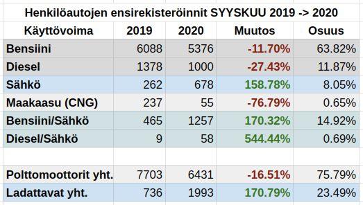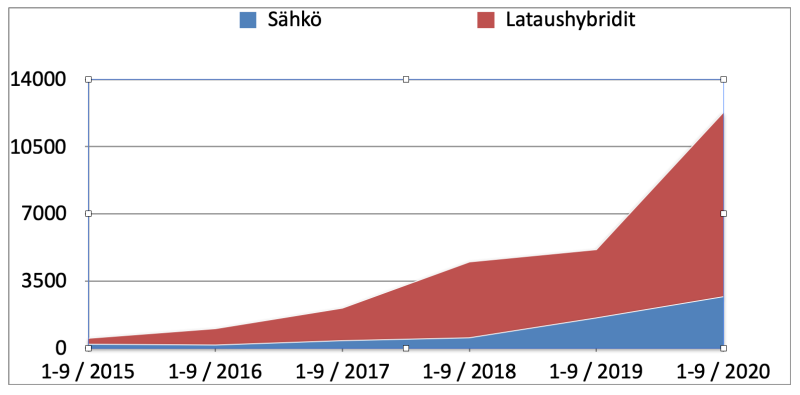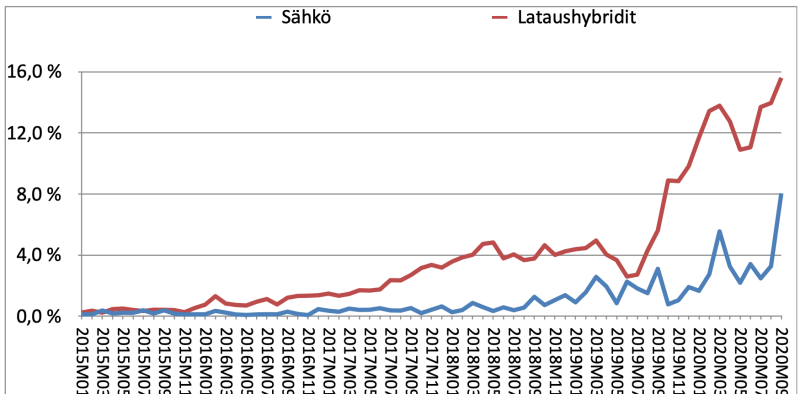 Myös osuusprosentit alkavat nousta jo hyvin merkittäville tasoille, koska sähköautoja oli syyskuussa 2020 ensirekisteröidyistä henkilöatoista 8,2% ja kaikkia latausautoja peräti 23,5%. Sähkö- ja lataushybridien osuus kaikkien henkilöautojen ensirekisteröinneistä onkin jatkanut jo pitkää nousujohteista trendiään kiihtyvällä tahdilla.