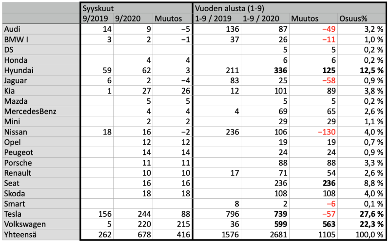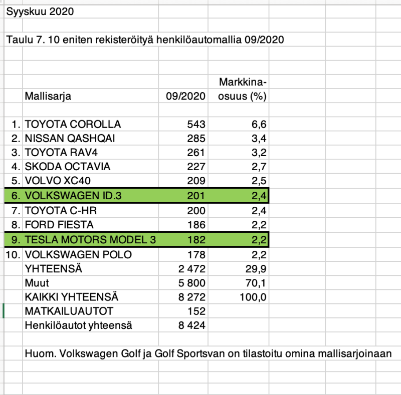 Ehkä kaikkein hienointa sähköautosyyskuussa 2020 oli kahden automallin nousu kaikkien henkilöautojen mallikohtaisen tilaston kymmenen kärkeen. ID3 nousi peräti 6. sijalle 201 kappaleella ja Tesla sijoittui 9. 182 kappaleella.