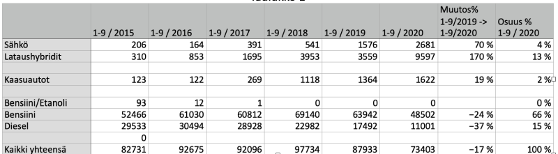 Autojen ensirekisteröinnit ja etenkin sähköautojen osalta heittelevät yksittäisinä kuukausina paljon ja siksi etenkin tässä pandemian ajassa on olennaista tarkkailla pidempiä aikajaksoja. Siksi tulostin vuosilta 2015 - 2020 kolmen ensimmäisen kvartaalin kumulatiiviset lukemat myös. Niissä näkyy selkeästi poikkeusolojen vaikutus kokonaisrekisteröintimääriin koko ajanjaksolla tammi - syyskuu 2020.