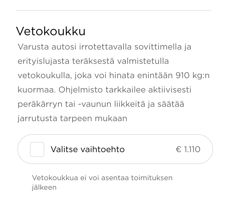 Hintaa koukulle kertyy uuden ajoneuvon tilauksen yhteydessä ruksittuna 1110 euroa ja jälkiasennus ei ole mahdollinen.