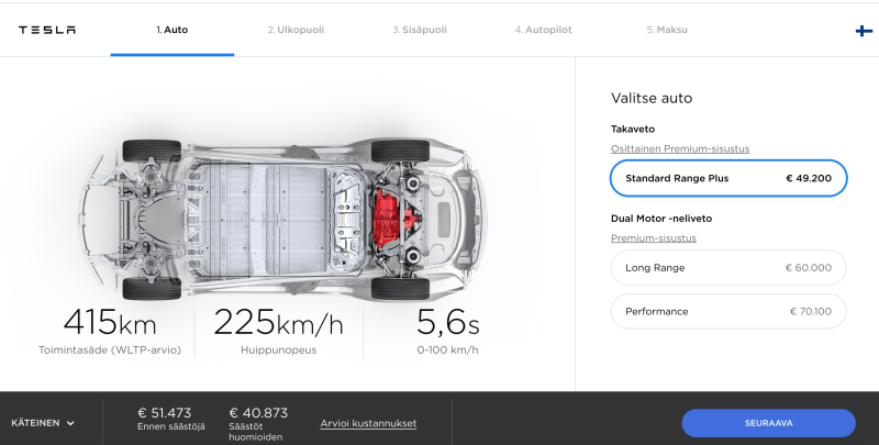 Teslan Model3:sen hinta alkaa toukokuussa 2019 Suomessa Standard Range Plus -mallin 51 473 euroasta ja tähän tämän hetken "hinnat alkaen" -malliin on saatavilla myös vetokoukku ja siihen kerrotaan tilaussivustolla sallitun 900 kg:n vetomassan. Tilaussivustolta ei asia ilmene, mutta oletan tuon tarkoittavan jarrullisen kärryn vetomassaa, koska Suomessa jarruttoman suurin sallittu vetomassa on 750 kg.