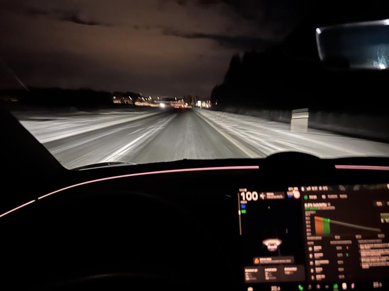 Testipäivänä oli erikoisen pienillä alueilla suuresti vaihtelevia pakkaslukemia. Auto haettiin Lempäälästä ja ajettiin ensin Tampereen Ikean Teslan Super Charger -laturille saamaan vajaaseen akkuunsa täytettä. Ikean ja Tampereen kotimme välilla pakkanen hetkellisesti kiristyi jopa -12°C lukemaan. Testipäivänä vallitsi navakka pohjoistuuli ja lisäksi oli jakuvasti huomattavan voimakkaita tuulenpuuskia. Teillä oli aiemmista lumisateista lumipolannetta urien muodossa. Helsingin päässä teillä oli paksu lumipuuro. Moottoritiellä lumipolanteesta vapaat kohdat olivat erittäin liukkaita.