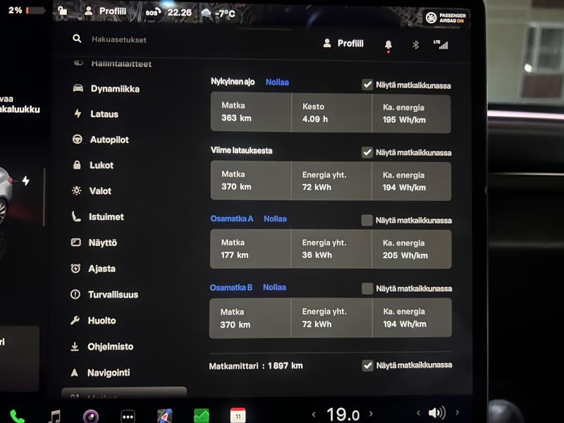 - Omistajien usein paljon kehumasta Autopilotista totesin jälleen, että se ei sittenkään ollut minun makuun yhtä hyvä kuin esimerkiksi Volkswagenin Travel Assist. Autopilttia ei meinannut saada oikein millään edes päälle olosuhteissa, joissa TA vielä menee päälle ja toimii auttavasti. Lumipolanteisilla teillä AP haki tarpeettoman paljon ajolinjaa.
