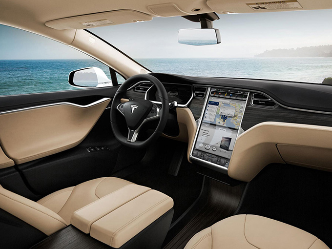 Model S sisustus on vaaleaa nahkaa ja laadukkaita pintoja. Kaikille Teslaan yhtään tutustuneet jo tietävätkin, että hallitseva osa kuskin paikan näkymissä on suuri pystyyn sijoitettu 17" kosketusnäyttö, josta voi tehdä lähes mitä vain.
