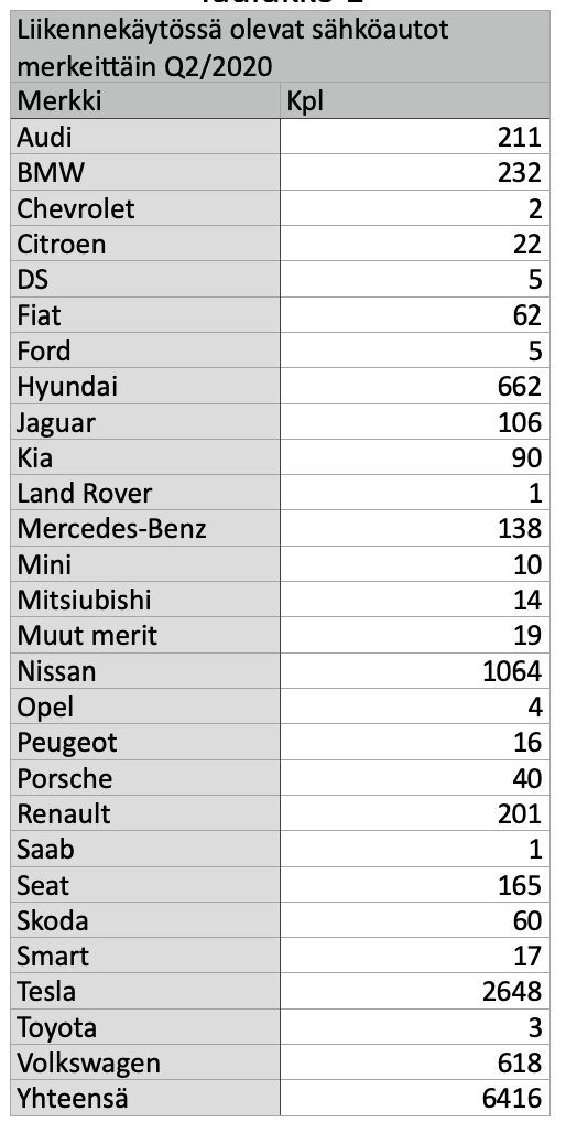 Merkkikohtaisesti katsottuna vuoden 2020 puolivälissä ylivoimaisesti yleisin sähköautomerkki Suomessa 2648 kappaleellaan. Jossain vaiheessa vielä kärkipaikkaakin pitänyt Nissan on joutunut antautumaan kauas taakse 1064 kappaleellaan ja Hyundai 662 sekä Volkswagen 618 kappaleellan menevätkin pian siitä ohitse.