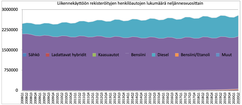 Yhteensä henkilöautoja oli tieliikennekäyttöön rekisteröitynä vuoden 2020 puolivälissä 2 788 271 kappaletta, joka on korkein määrä 12-vuoden ajanjaksolta, jolla sain Traficomin Tilastotietokannasta luvut raportoitua.