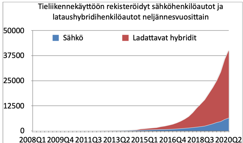 Kun mukaan otetaan myös lataushybridit, eli huomioidaan kaikki tieliikennekäyttöön rekisteröidyt latauskelpoiset henkilöautot, näyttää kasvu jopa vielä voimaakkamalta. Latausautojen lukumäärän kasvu on ollut huimaa. Vuoden 2020 puolivälissä tieliikennekäyttöön oli rekisteröitynä yhteensä 40 315 kappaletta latauskelpoisia henkilöautoja, joista 33 883 kappaletta oli lataushybridejä.
