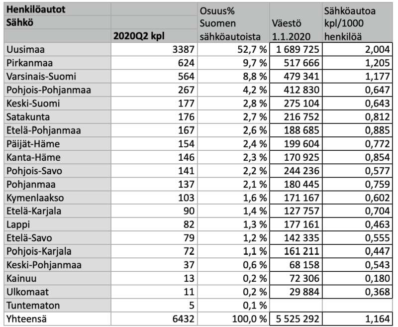 Sähköautoista 52,7% on rekisteröity Uudellemaalle ja siellä on 2,004 sähköautoa tuhatta henkilöä kohden. Pirkanmaa (1,205 kpl/1000 henkilöä) ja Varsinais-Suomi (1,177 kpl/1000 henkilöä) ylittävät myös yhden sähköauton tuhatta henkilöä kohden rajan. Muut maakunnat jäävät tämän alle.