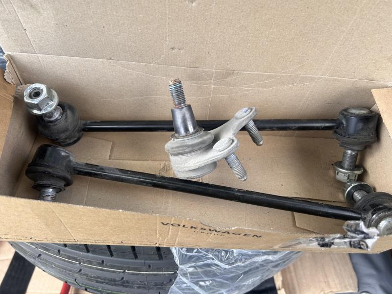 Alla olevassa kuvassa ID.4:mme murheenkrynin sijaintia, eli etujousituksessa niin sanotut koiranluut, eli konkreettisemmin vakaajan pystytangot. Ne kuluvat meidän ajolla vuosittain vaihtokuntoon. Nyt paikallaan oli Motonetin edulliset koiranluut, mitkä laitatin paikalleen muualla kuin Volkswagenin valtuuttamassa merkkikorjaamossa. Tällä kertaa ne kestivät alle kuukauden! Nyt paikalleen asennettiin laadukkaiksi väitetyt Lemförderin osat. Lisäksi vaihtoon meni alapallonivel toiselta puolelta.