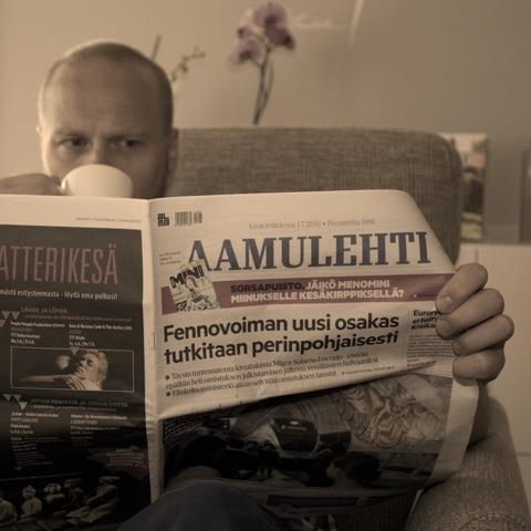 Näyttelyosasto 1: Perheen isä lukee aamukahvilla paperista sanomalehteä