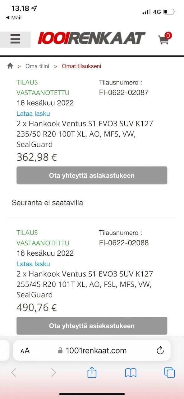 Yritin ensin etsiä renkaita Tampereen rengasliikkeistä ja sitten laajemmin Suomesta, mutta löysin niin huonosti tai en lainkaan, että ensimmäisen kerran päätin kokeilla netistä autoon renkaiden tilaamista. Googlen avulla 1001Renkaat valikoitui tilauksen kohteeksi. Toimituksen sekä asennuksen valitsin ET-Autotech -yritykseen Tampereen Vehmaisissa. Kumit saapuivat sinne noin viikossa ja sovin ennalta asennusajankohdan.