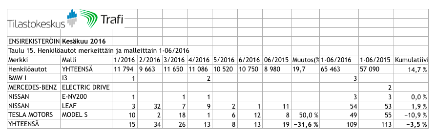 Uusien sähköautojen (BEV) ensirekisteröinnit edelleen alamaissa kesäkuussa 2016