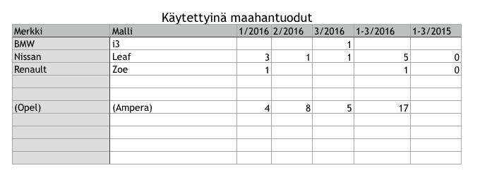 Q1/2016 tuotiin maahan käytettyinä yhteensä kuusi sähköautoa, kun vastaavana aikana viime vuonna ei tuotu yhtään. Näistä alkuvuonna tuoduista viisi oli Leafeja ja yksi oli Renault Zoe.