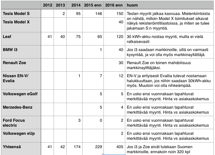 Yksittäisten autojen tarkkoja lukumääriä olennaisempi on se, että päädyin ennakoimaan kokonaismäärän kasvavan jopa 77% tasolla vuodesta 2015. Ennakoin siis että vuonna 2016 rekisteröidään 320 - 410 täyssähköautoa. Jos BMW ja Renault eivät markkinoillemme tulekaan, päädyn ennakoinnissani tuohon alempaan lukemaan.
