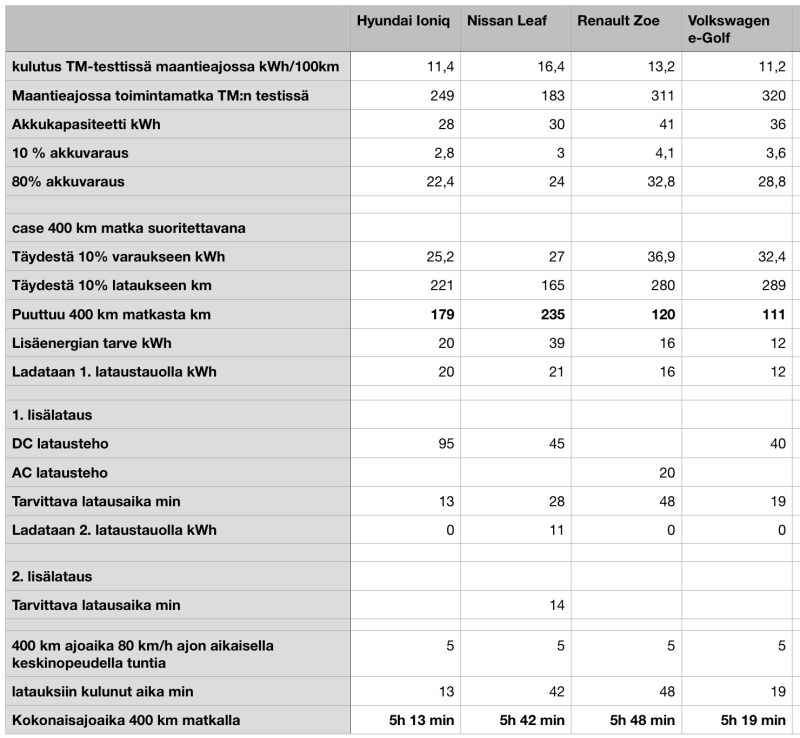 TM:n vertailussa saavuttamilla maantieajon kulutuksilla nämä tarkoittavat esimerkiksi latausaikoina seuraavaa kuvitteellisella 400 km ajomatkalla. Ioniq tarvitsee tuolla matkalla vain 13 minuutin lataustauon olettaen, että reitille sattuu 100 kW tehoinen CCS-pikalaturi. VW e-Golf tarvitsee toiseksi lyhyimmän lataustauon, noin 19 minuuttia. Leaf ja Zoe kamppaillevat pidemmästä lataustarpeesta. Todellisuudessa Leaf jää merkittävästi heikommaksi, koska olen laskenut nämä käyttäen TM-vertailussa käytettyjä akkukapasiteetteja. Leafin 30 kWh akusta on todellisuudessa käytettävissä vain 28 kWh, kun väittäisin kokemuksellani muissa olevan täydet kapasiteetit myös todellisuudessa käytettävissä. Lisäksi Leafia joudutaan lataamaan ainoana kahdesti tuolla matkalla, ja lataamisajan lisäksi kertyy siis kaksinkertainen siirtymäosuus aikaan lisää.