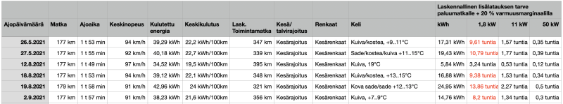 Näihin varauksiin liittyen haluan mainita, että säännölliseen Tampere - Helsinki -välin pendelöintiin löytyy myös paremmin soveltuvia sähköautoja, joissa on riittävän iso akku ja pienempi ilmanvastus. Esimerkiksi Teslan Model3 LR toimii paremmin.