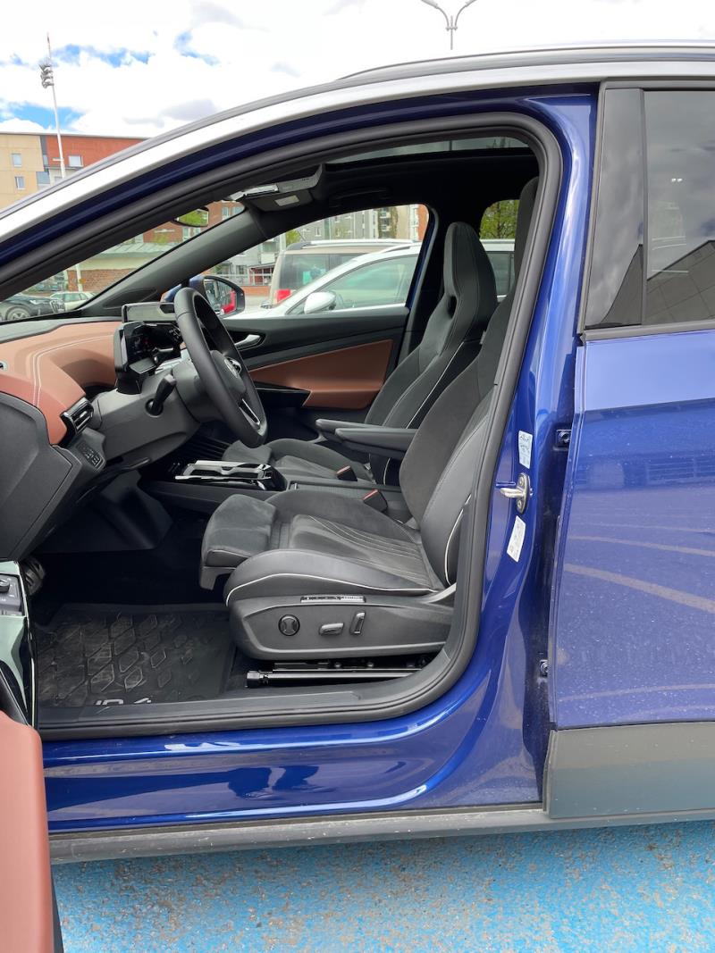 Kun istuu ID.4:n kuljettajan paikalle, on ensivaikutelma erittäin tilavasta ja jopa suuresta autosta (vertailukohtina omat e-208 ja Seat Leon ST). Auton 1,852 metrin leveys ja 1,631 mertrin korkeus tuntuvat etumatkustajien paikalla avaruutena. Max-varustellun auton etuistuimet ovat erittäin hyvät ja sähköllä saa säädettyä perussäätöjen lisäksi ristiseläntuen monipuolisesti. Istuinosan pituuden säätö, eli reisituki on käsin säädettävissä. Molemmissa alcantaraa muistuttavalla verhoilulla päällystetyissä etuistuimissa on kaksi muistipaikkaa ja hieromatoiminnot.