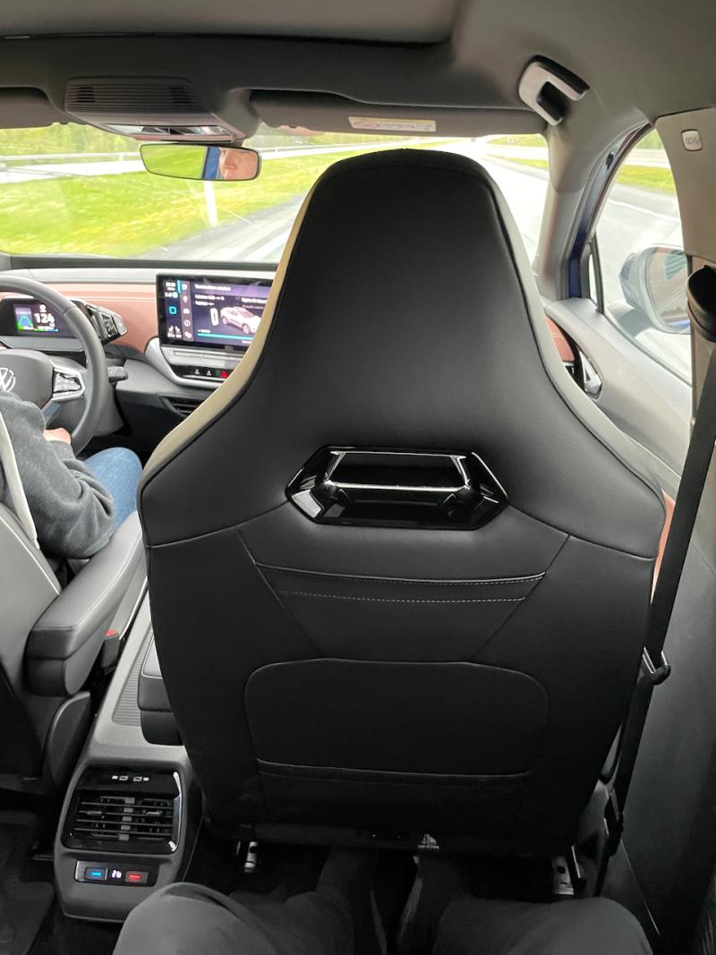 ID.4 MAX-varustellussa istuimessa huomasin, että halusin säätää ajosennon melko korkeaksi ja pystyksi, eli täysin päinvastoin kuin nykyisissä autoissamme. Auton korkeus riittää tähänkin ajoasentoon vaikka ajankin Stetson-hattu päässä. Hyvä niin.