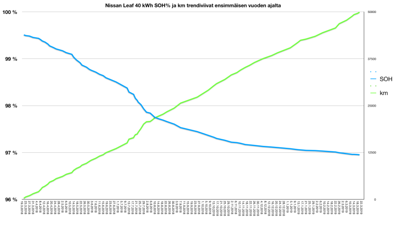 Nyt alkava kesä tosin vasta näyttää miten SOH:n lasku jatkuu. Viime kesänä oli akun kuntoisuudessa voimakas lasku, joka antaisi olettaa kuuman kelin sulattavan akun kuntoa nopeammin. Toisaalta voi olla myös niin, että SOH:n lasku on alussa nopeampaa ja on nyt tasoittunut loivemmalle tasolle, kuten kuvaajasta myös näkyy.
