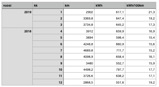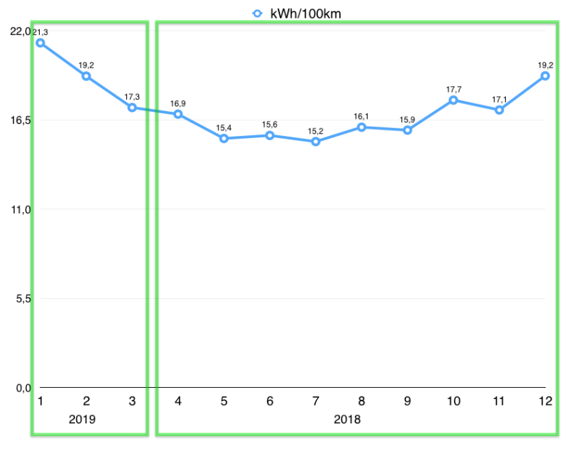 Suurimman kulutuksen kuukausi on ollut tammikuu 2019, jolloin toteutui 21,3 kWh/100 km lukema. Tuolloin taasen tammipakkaset ja jatkuva kattotaakan kuljettaminen nostivat runsaasti kulutusta. Joulukuun kulutuksella olisi toteutunut hieman alle 180 km laskennallinen toimintamatka.