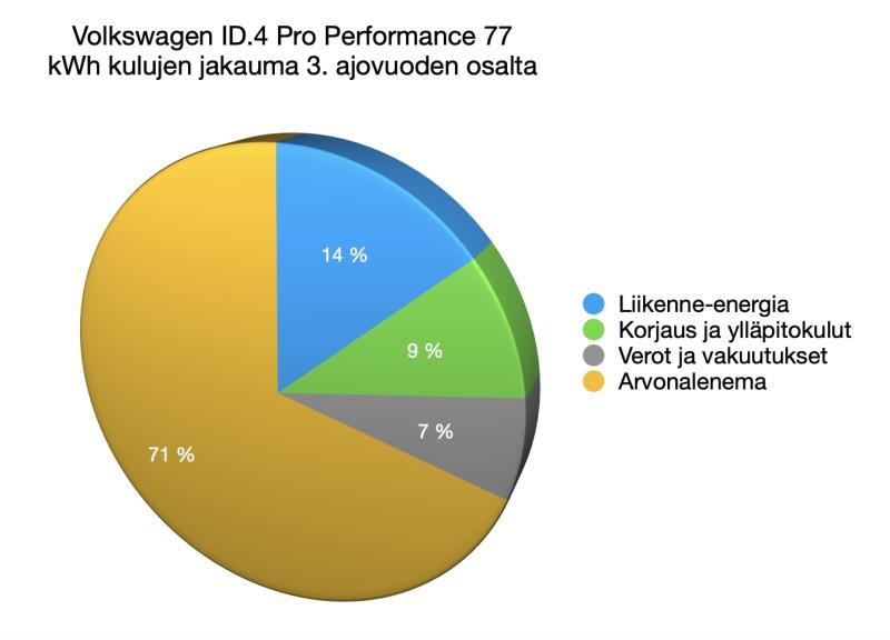 Auton arvon alenema on tietenkin ollut myös tämän vuoden aikana suurin kuluerä. Paljonko arvo sitten on vuodessa laskenut? Sitä joudun nyt vain arvioimaan. Pidän edelleen toimivana nyrkkisääntönä, että paljon ajavan auton arvo putoaa puoleen kolmessa vuodessa. Niin on näyttänyt käyvän myös tälle ID.4:lle, tai sitten se on pudonnut jopa hieman enemmän. Joka tapauksessa suurin arvonalenema 61 000 ostohinnasta on tapahtuntut jo ensimmäisen ja toisen vuoden aikana. Pidän realistisena arviona kuitenkin, että myös kolmantena vuotena auton arvon alenema olisi ollut 10 000 euron luokkaa sellaiselle, joka sen olisi vuosi sitten käytettyjen hallista ostanut. Korostan, että tämä on vain suuntaa antava oma arvaukseni. Lasken kuitenkin sillä arvolla