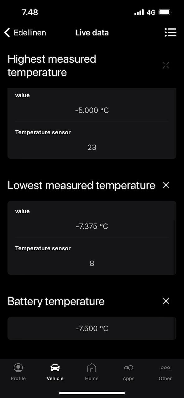 Tänään oli aamulla pakkasta -22..-24°C kun tein aamuisen työmatkasiirtymän. Auton akku oli lähtiessä reippaasti pakkasen puolella. ID.4 alkaa 3.2 softalla lämmittämään akkua vasta ajoon lähdettäessä ja pyrkii saavuttamaan vain noin +2°C lämpötilan akustoon. Toki ID:kin lämmittelee ajoakkkua, jos sen sisälämpötila laskee kovin alas ja estää näin akuston ns syväjäätymisen. Tällä kertaa noin 15 minuutin ajon jälkeenkin akuston lämmitys oli saavuttanut vasta -7,5°C lämpötilan. Akun lisäksi lämmitettävänä oli auto sisätilat, vaikka niitä lämmitettiin viitisen minuuttia ennen liikkeelle lähtöä, jolla saatiin lasit sulaksi. Vielä puolen tunnin ajon kohdallakin auto käytti akuston sekä sisätilan lämmittämiseen 5,3..6 kW:n verran tehoa.