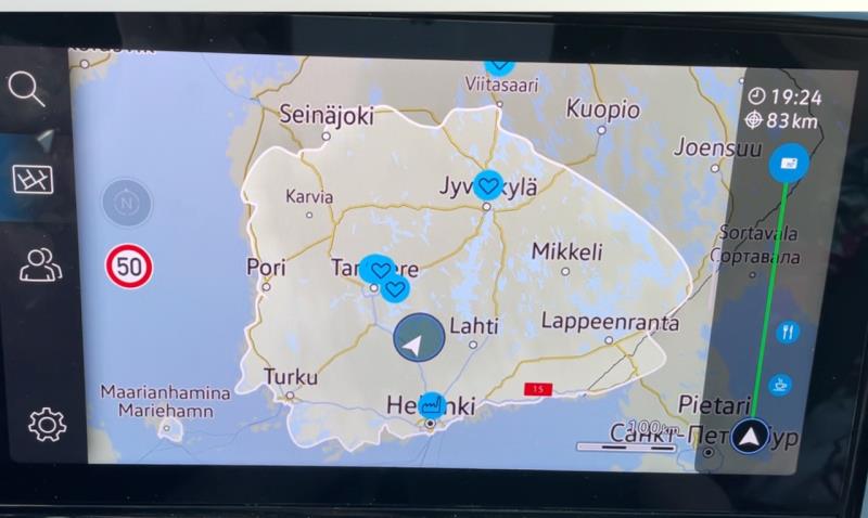ID.4 näyttää navigaattorin kartalla alueen, johon vallitsevalla akun varauksella pääsee ja tuo on yllättävän oikeellinen tieto. Nyt ajoakun 50% varaustasolla kartalle piirtynyt alue kattoi koko eteläisen suomen siten, että kaari kiertää huomattavasti linjan Pori - Jyväskylä - Mikkeli - Lappeenranta yläpuolella. Eli väestöllisesti katsottuna vahvasti suurin osa suomalaisista pääsisi 100% varaustasolla lähtiessä väestöllisestä keskipisteestä käymään toisen luona ja vielä voisi ajaa takaisin lataamatta lainkaan.