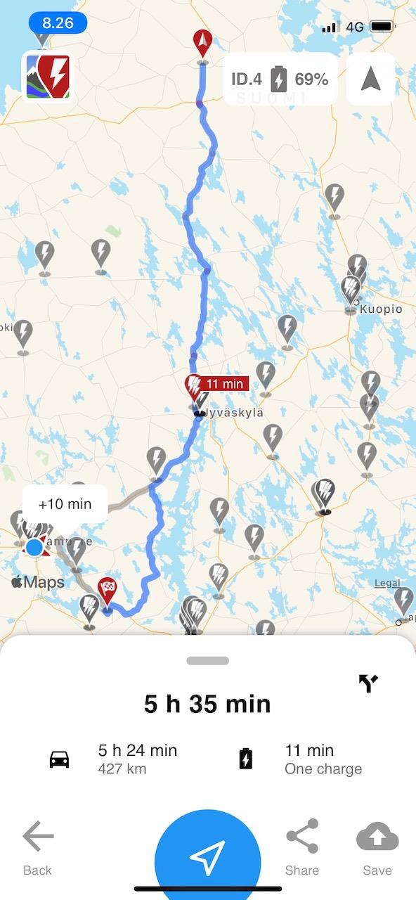 Asiaa voi tarkastelella myös toimintamatkan kautta, eli kuinka pitkälle yhdellä akullisella pääsee yhteen suuntaan ennen kuin tarvitsee ladata lisää. ID.4:n 77 kWh akulla pääsee Weberin pisteestä pohjoiseen päin noin 400 km päähän, eli Kärsämäelle asti. Totuuden nimissä itse pysähtyisin jo aiemmin pitämään yhden jaloittelu sekä kahvi- ja vessatauon ja lataisin samalla autoa. (laskin 19 kWh/100km maantiekulutuksella).