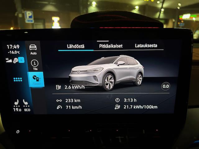VW ID.4 kulutustesti -21°C kelissä 233 km matkalta