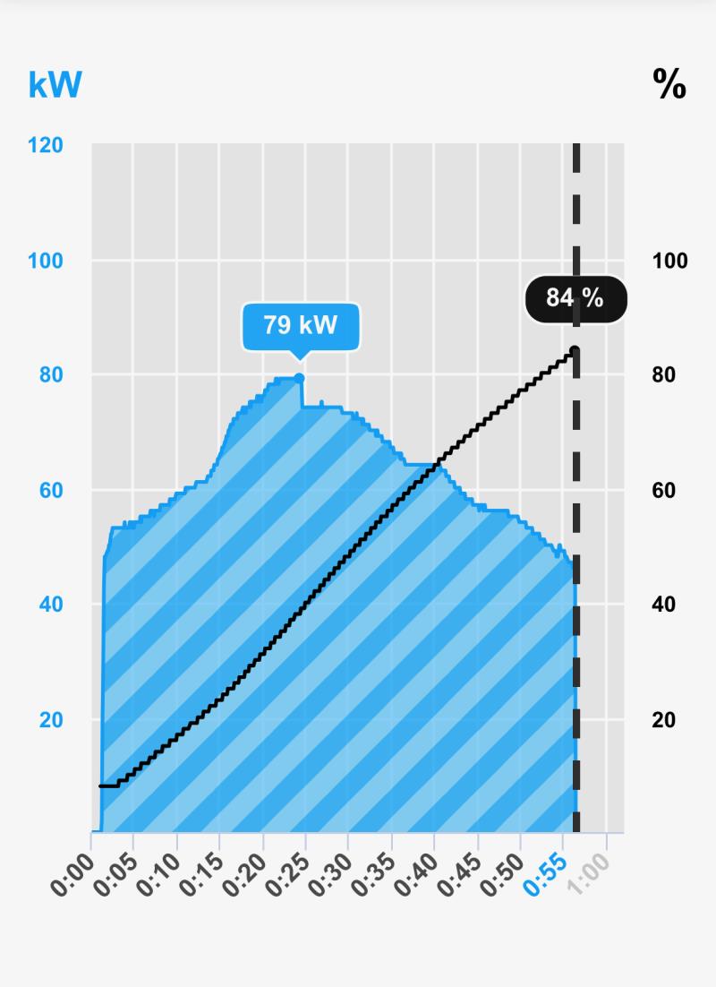 Loppulatasin auton samaan 84 % tasoon, missä se oli testilenkille lähtiessä. Lataus kesti 55 minuuttia ja siinä ajassa toimitettiin 57,489 kWh energiaa. Latauksen keskiteho siis toteutui matalalla 63 kW:n tasolla. Tällä lisälatauksella olisi siis pystynyt ajamaan toisen 233 km ennen seuraavaa latausta. Suurin hetkellinen latausteho oli 79 kW. Kyllä, seuraavassa sähköautossani tulee olemaan myös akuston esilämmitys suurteholatausta varten.