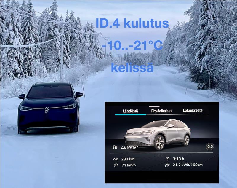 ID.4:n kulutus maantieajossa -10..-21°C kelissä